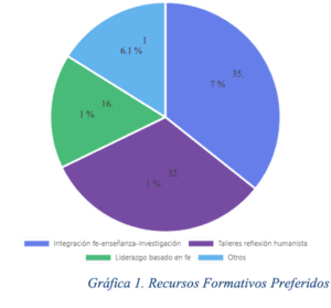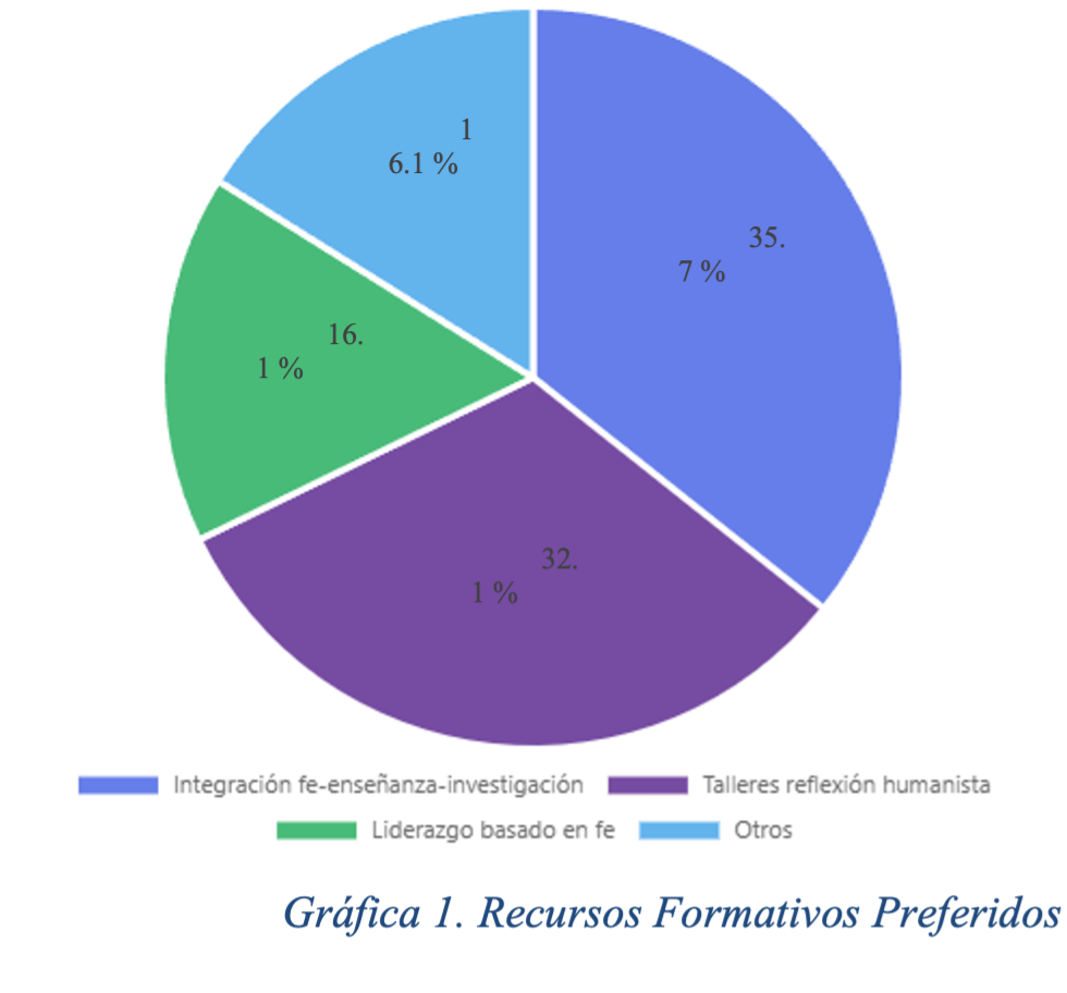 Los datos cuantitativos revelan las preferencias formativas del profesorado encuestado. Un 35.7% de los académicos expresó interés en recursos sobre integración fe-enseñanza-investigación, mientras que el 32.1% mostró preferencia por talleres de reflexión humanista y un 16.1% por talleres sobre liderazgo basado en la fe (Gráfica 1). Esta distribución equilibrada sugiere la necesidad de un programa formativo integral que aborde tanto aspectos prácticos de integración disciplinar como dimensiones reflexivas y de liderazgo transformador.