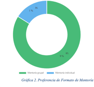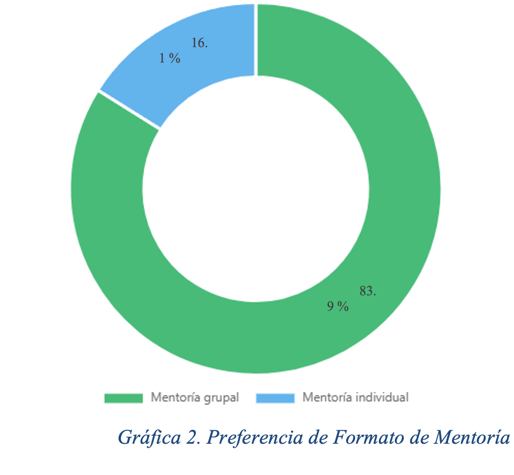 La configuración práctica del programa responde tanto a las necesidades concretas de los académicos como a esta visión teológica. Los datos cuantitativos revelan una preferencia clara por el formato grupal de mentoría, con un 83.9% de los encuestados inclinándose por esta modalidad (Gráfica 2), lo cual tiene implicaciones significativas para el diseño del programa. Esta preferencia no solo permite optimizar los recursos humanos disponibles y facilitar el aprendizaje colaborativo, sino que también favorece la construcción de una verdadera comunidad académica, reduciendo al mismo tiempo la presión individual y el tiempo requerido por participante. Sin embargo, el programa mantiene la flexibilidad necesaria para desplegarse en múltiples formatos: individual, grupal, entre pares, informal, reverse mentoring y modalidades de intercambio interinstitucional, estableciendo siempre reglas claras de trabajo, calendarios de encuentros, metas e indicadores de crecimiento.