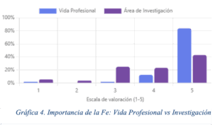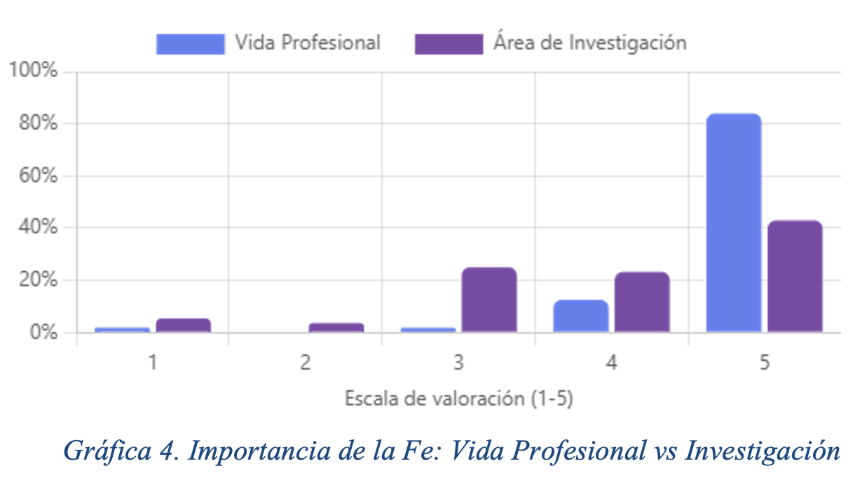 Existe una interesante dualidad en la percepción del rol de la fe en el ámbito académico. La importancia de la fe en la vida profesional recibió una valoración promedio de 4.77 sobre 5, con un impresionante 83.9% de los académicos otorgando la máxima calificación. En contraste, la importancia de la fe en el área específica de investigación obtuvo un promedio de 3.95 sobre 5, con solo el 42.9% otorgando la máxima calificación (Gráfica 4).