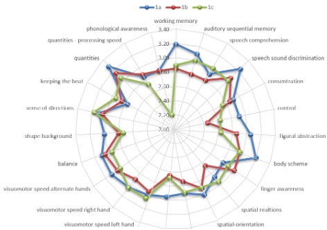 Figure 3. Radar Graph Representation of the Performance Profiles of Three First-Grade Classes
