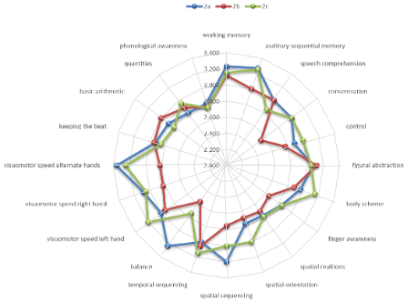 - Sensorimotor functions: movement rhythm, spatial orientation, visual and auditory perception, sequentiality