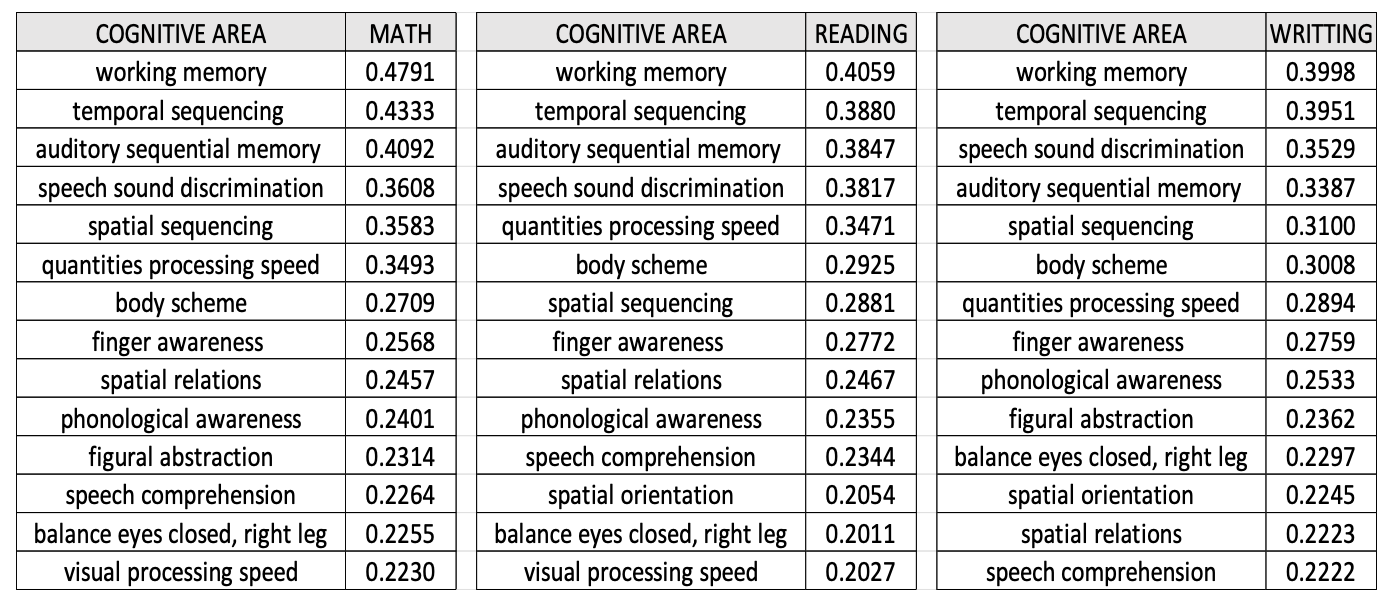 The Sensorimotor and Cognitive Profile Test proved highly effective in identifying critical developmental domains linked to academic success. The strong predictive power of working memory, sequential processing, phonemic awareness, and sensorimotor integration underscores the importance of shifting educational diagnostics from surface- level performance toward foundational functions. This is especially relevant for children in the early stages of schooling (ages 5–8), where intervention timing can influence long- term trajectories.